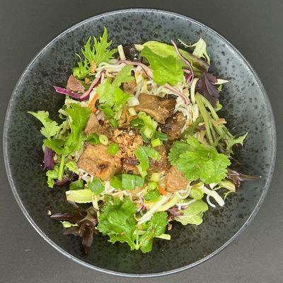 A delicious mix of fresh vermicelli noodles, mixed salad, apple, pickled carrot, red and green cabbage, chopped mint, coriander dressed with a tangy sweet and sour dressing, topped with crackling pork belly.