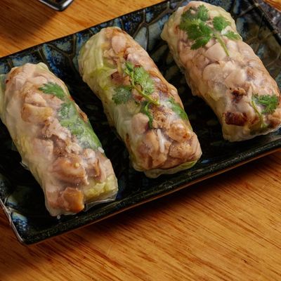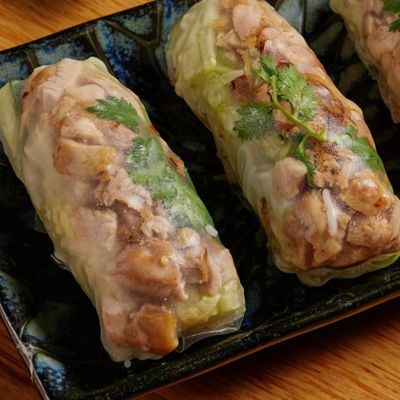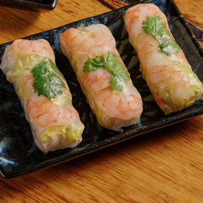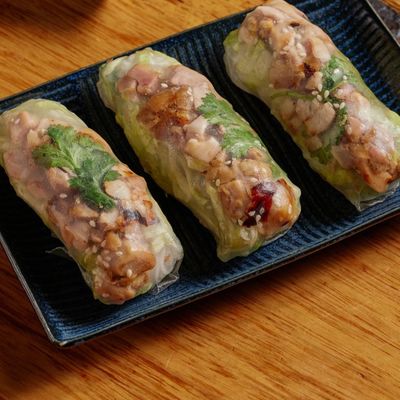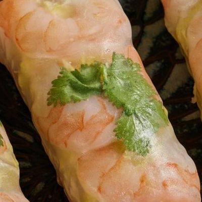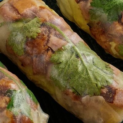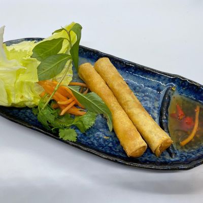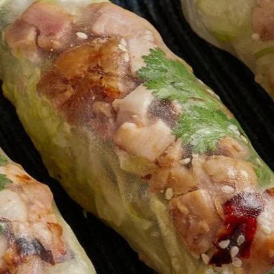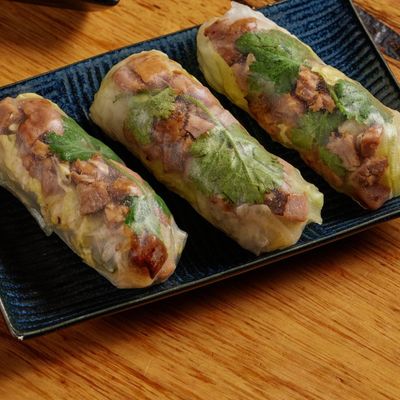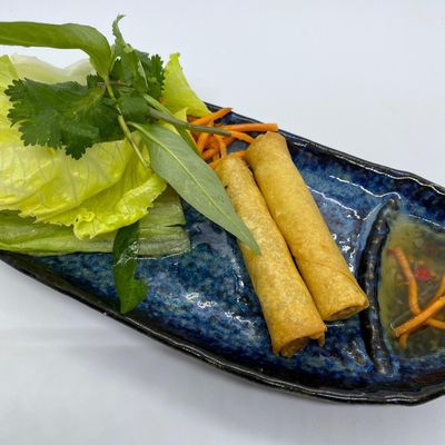 Delicate rice paper encasing thin vermicelli noodles, lettuce, coriander and fried shallots.