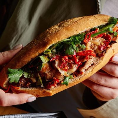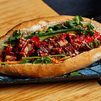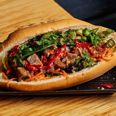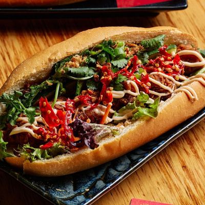 Crispy Vietnamese roll with nem nuong pork sausage, layered with our own special pate, chilli mayonnaise, mixed lettuce, pickled carrot, cucumber, coriander, spring onion, fried shallots and banh mi sauce and sweet chilli sauce.
