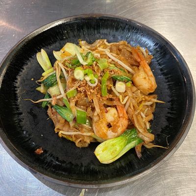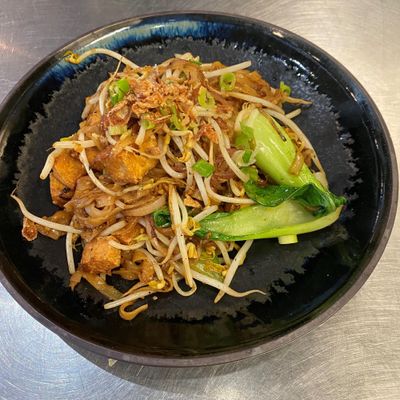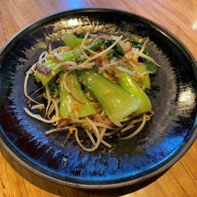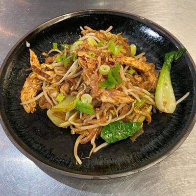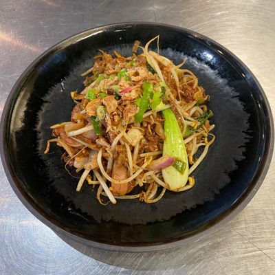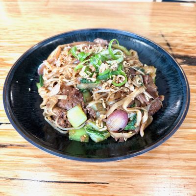 Vietnamese stir fry noodles with spicy sriracha and sweet soy sauce, garlic, red onion, pho noodles, bok choy and beanshoots, garnished with fried onion and spring onion.