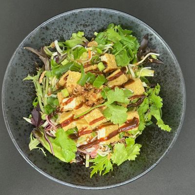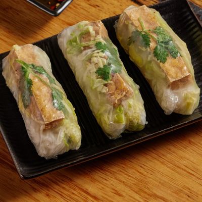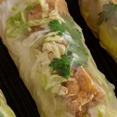 Crispy Vietnamese roll with fried tofu, chilli mayonnaise, mixed lettuce, pickled carrot, cucumber, coriander, spring onion, fried shallots, banh mi sauce and hoisin sauce.