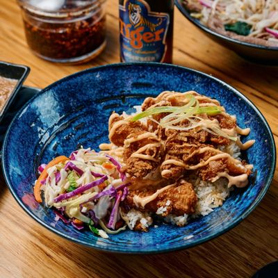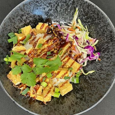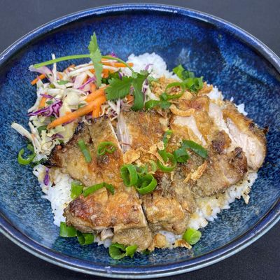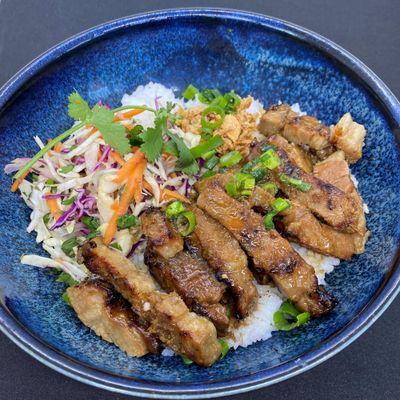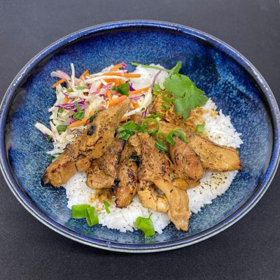 Steamed jasmine rice, Asian slaw and garnished with fried shallots, coriander and spring onion.