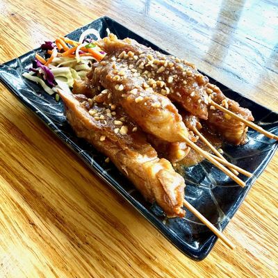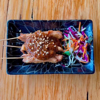 Twice cooked chicken skewers with spicy peanut sauce, crushed peanuts and Asian slaw.