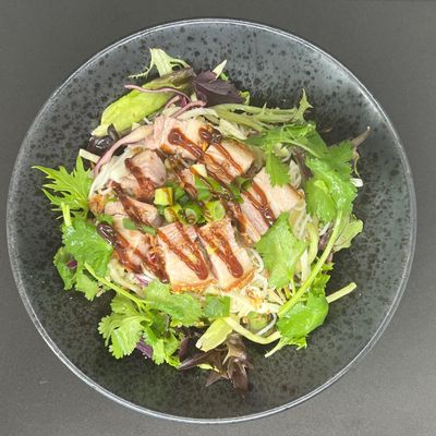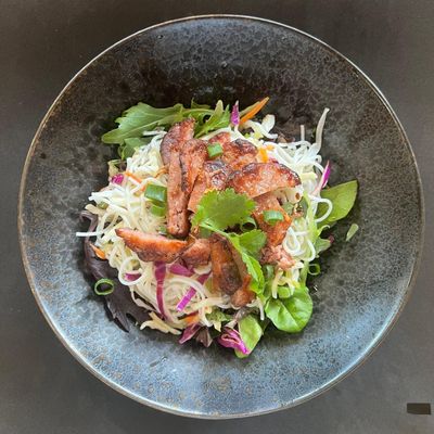 A delicious mix of fresh vermicelli noodles, mixed salad, apple, pickled carrot, red and green cabbage, chopped mint, coriander dressed with a tangy sweet and sour dressing, topped with bbq pork.