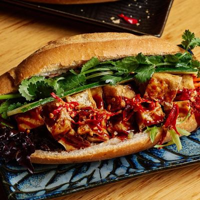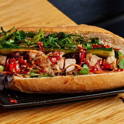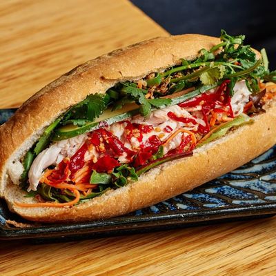 Crispy Vietnamese roll with hand-shredded chicken breast, layered with our own special pate, chilli mayonnaise, mixed lettuce, pickled carrot, cucumber, coriander, spring onion, fried shallots and banh mi sauce.