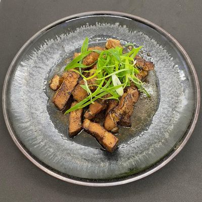 Charred marinated pork with a sweet soy, oyster and lemongrass sauce.