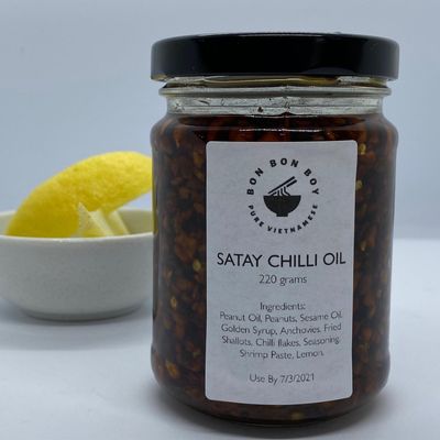 Our signature Satay Chilli Oil. Ingredients: Peanut oil, peanuts, sesame oil, golden syrup, anchovies, fried shallots, chilli flakes, seasoning, shrimp paste, lime.